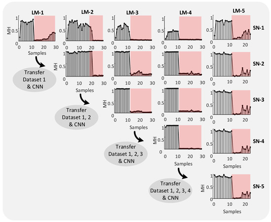 The testing process of SN-1 can be seen in the first row of Figure 7 for five datasets collected from LM-1 to LM-5. The images obtained from the generalization phase are used as samples whose similarity indexes are calculated using SN-1. In the next step, the CNN part of SN-1 is transferred to SN-2. The FCNN part of SN-2 is trained with images sent to SN-1 for testing. The results of SN-2 are demonstrated in the second row of Figure 7. The next SN, constructed by using the CNN from SN-1, the FCNN of SN-3, is trained in the same way by using the images obtained from the first and second steps. This process is repeated for SN-4 and SN-5 in the same way. The training process of the FCNN part of SN-2 to SN-5 is given in Figure 7. More samples cause an increase in the separation of unhealth and health regions and decrease the loss.