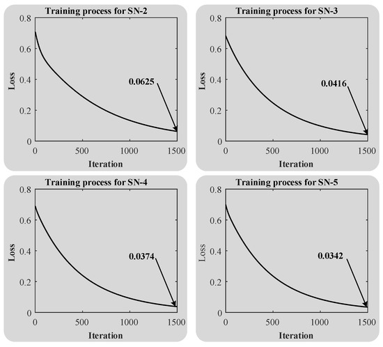 On the other hand, the SN-2 is partially trained with the data of LM-1 to make the boundaries even clearer. A significant improvement is seen at the end of the training in all datasets from LM-2 to LM-5. All training progress can be observed in Figure 8, where there is a gradual decrease in loss with increasing the number of samples. At the end of the training, the healthy tip is approximately 1, while the unhealthy tip is 0. Only three samples in the LM-2 were incorrectly classified.