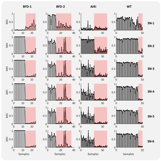 This data [154,155] is an artificially created dataset by using a random walk process. The simulated machine failure consists of five modes: tool wear failure, heat dissipation failure, power failure, overstrain failure, and random failures. If at least one of these failure modes is true, the process fails, and the ‘machine failure’ label is set to 1. The number of data samples is 100,000 with 13 features. The 30 failure cases and 30 health cases are used in this study because the dataset is too large for our aim.