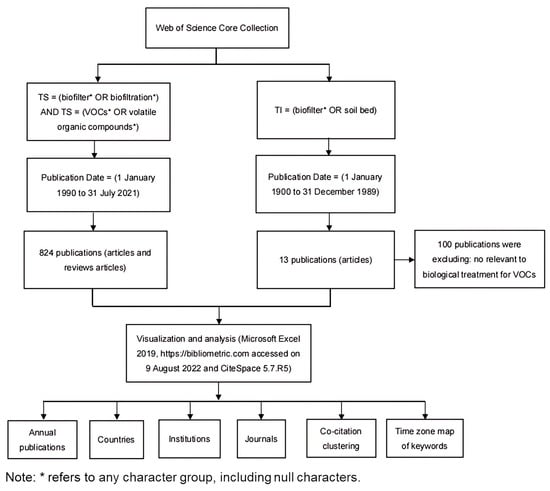 The literature data used in this paper are from the Web of Science core collection (WOSCC) database, encompassing authoritative and high-impact academic journals across various subject areas. Abstract and keyword information was not included in the WOSCC data for articles published in 1990 and before. As a result, the search strategy was divided into two parts. In the first part, the search term “TS = (biofilter* OR biofiltration*) AND TS = (VOCs* OR volatile organic compounds*)” was used, and the publication types “Article” and “Review” were selected. The literature retrieval period was set from 1 January 1990 to 31 July 2021, and this resulted in obtaining a total of 824 publications. The first part of the literature was used as the primary data for analyzing the progress of related research using the visualization software CiteSpace. The search strategy in the second part was altered to “TI = (biofilter* OR soil bed)”, with the publication types “Article” and “Review” selected. The retrieval period time was set from 1900 to 1989. A total of 114 search results were obtained, and after manually screening papers related to the topic, 13 papers were selected to understand the developmental history of global biofiltration. As the data in the second part lacked citation information, they were not imported into CiteSpace, and only the relevant contents were directly reviewed.