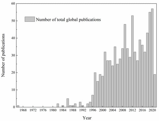 Figure 2 illustrates the annual number of studies published worldwide in the literature retrieved from WOSCC. The results indicate that the number of studies increased slowly until 1997. The initial publication in 1966 by Carlson and Leiser [] used biofiltration to remove odor and emphasized the crucial role of microorganisms in the soil in odor removal. This was followed by the promotion and application of biological treatment technologies in European countries through the 1980s. From 1997 onwards, there was a substantial increase in the number of published papers, which exhibited an upward trend. Among the published papers, the most-cited article is the review published by Faisal and Aloke in 2000, titled “Removal of Volatile Organic Compounds from polluted air” []. They presented and evaluated each technology for VOC control in detail and concluded that biofiltration would be the most popular option in the future.