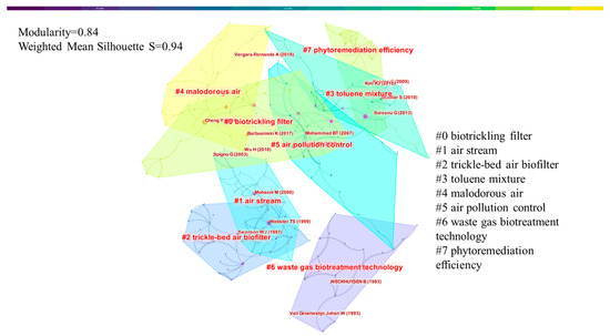 Table 3 shows the details of the eight main clusters, including the cluster silhouette, the average year, and the topic identifiers. The cluster silhouette serves as an assessment metric for the clustering function, and the closer it is to 1, the better the clustering performance. The average year represents the period when more research outcomes were published. Cluster identifier words are generated according to the publication titles with the highest number of citations in each cluster. Through the color clustering in the co-citation map combined with the literature reading before 1990, we can understand the development of the research field of biological removal of VOCs.