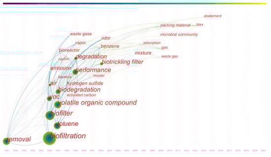 The collaboration network of countries was established based on country collaborations in the cited literature, and collaboration was considered to exist when authors from two different countries contributed to the same article. Based on the publications related to the research topic that appeared between 1900 and 2021, the countries with more than 10 publications and the network of collaborations between them are shown in Figure 3. The circle color scale radiating outward from the center corresponds to the year of publication. The color ranges from dark purple to yellow-green, indicating early to recent years, respectively. In addition, the color of the circle’s center represents the earliest year of publications, while the thickness of the color scale corresponds to the number of publications in the respective years. The United States’ and Canada’s circle centers are dark purple, indicating that relevant research was conducted at the earliest time. The average annual number of publications in the United States is evenly distributed, suggesting that there are continuous research outcomes published in this field. On the other hand, China’s and Spain’s circle centers are dark green, signifying that research in these countries started later. The color levels for China are predominantly from light green to yellow, implying that the main research results have been published in recent years. The size of the circles corresponds to the total number of publications. As shown in the figure, the number of publications in the United States is significantly higher than that in other countries, indicating that the United States holds a leading position in the field of biological VOC removal research. Additionally, several countries in the figure have nodes encompassed by rosy-red circles outside, which denote points with high intermediary centrality in the network. Intermediary centrality is a commonly used indicator for centrality measurement, representing a pivotal node with strong connections to other nodes. Countries such as the United States, Spain, and Canada have more interactions and collaborations with scholars from other countries in this field.