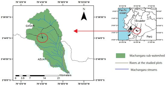 The sampling was carried out in the El Labrado sector (2°40′40.23″ S, 79°4′30″ W) (Figure 2) of the upper basin of the Chuico River tributary of the Machángara, located in the austral zone of Ecuador at 3400 m.a.s.l. The area has a daily mean temperature of 8 °C, a min value of 6 °C, and a maximum of 10.6 °C. The area is located between the provinces of Azuay and Cañar. The isolation of the area grabs the attention of many scientists as an important area for biological studies. The area is part of the biosphere reserve “Macizo del Cajas”, which is globally considered an area of high natural, scientific, and cultural value. This national park has a large number of elements that, as a whole, constitute an ecological heritage of great importance [26].