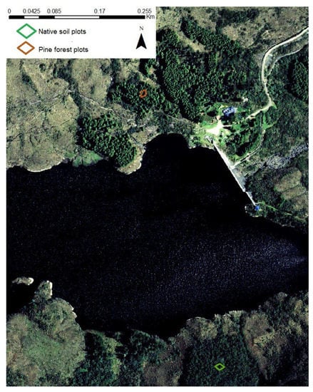 This study sampled soils under vegetation cover with native forest and pine forest land use. At each site, we established 10 m2 plots with squares delimitated with a grid; we randomly selected ten quadrants per forest. As shown in Figure 3, one can see the “patches” of pine forest within the Andean ecosystem. For this reason, the research plots were built in the pine forest and the native vegetation, allowing us to compare two different ecosystems within the same area.