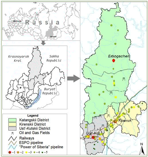 | 2 | 2 | There are two towns: Ust-Kut (36.9 thousand people) and Kirensk (10.9 thousand people). These small towns, which are administrative district centers, have the most advantageous transport and geographical positions in the area under study. These settlements are characterized by a concentration of goverment and public organizations and the most diversified economies. They are trans-shipment bases for shift workers, so these small towns are characterized by the specific impacts of industrial development [61], which also affect the sustainability of local communities [35]. District administrations have socioeconomic agreements with the main oil and gas companies operating in the territory. Therefore, various social projects supported by industrial sponsors are often implemented in these towns. |