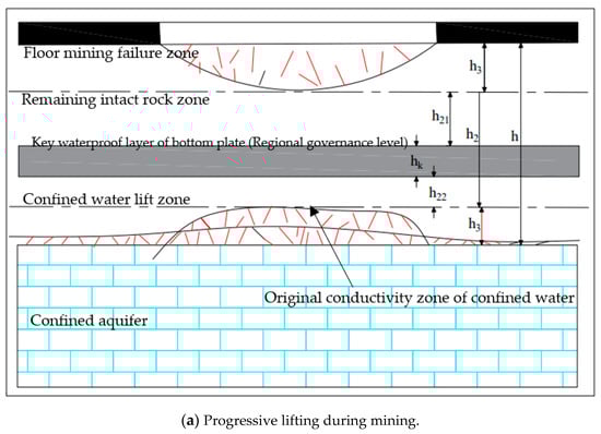 Prior to coal seam mining, hydraulic conductivity cracks of varying heights develop upwards on the top interface of the floor-confined aquifer. This is the original hydraulic conductivity of the confined water. Post-mining, the surrounding rock of the stope is deformed and destroyed, resulting in a floor mining failure zone with a depth of h1. Simultaneously, due to the combined effects of mining pressure and confined water pressure, the confined water on the floor is further directed upward along the original water diversion fissure to create a progressive uplift zone of confined water. The total height of the original elevation zone of confined water and the progressive uplift zone of confined water is known as the confined water uplift zone, with a height of h3, as illustrated in Figure 8a. When the mining damage zone of the floor connects with the confined water uplift zone, water inrush from the floor of the working face occurs, and vice versa. There is an undamaged rock zone left between the floor mining failure zone and the confined water guide zone [28,29]. Moreover, the effective water-resisting layer thickness of the floor changes from h before mining to h2, , where hk is the thickness of the key waterproof layer of the bottom plate. As the working face continues to advance, the mining damage depth of the floor further increases and peaks at , where is reduced to . Similarly, under the combined action of the mining pressure and confined water pressure, the confined water on the floor will continue to rise gradually and finally move to the lower part of the key water-resisting layer on the floor. Consequently, the height of the confined water guide zone will become , . The effective water-resisting layer thickness of the floor is reduced to , , as depicted in Figure 8b.