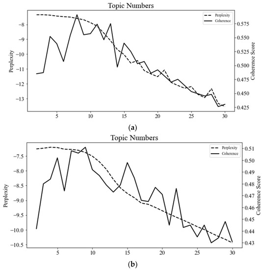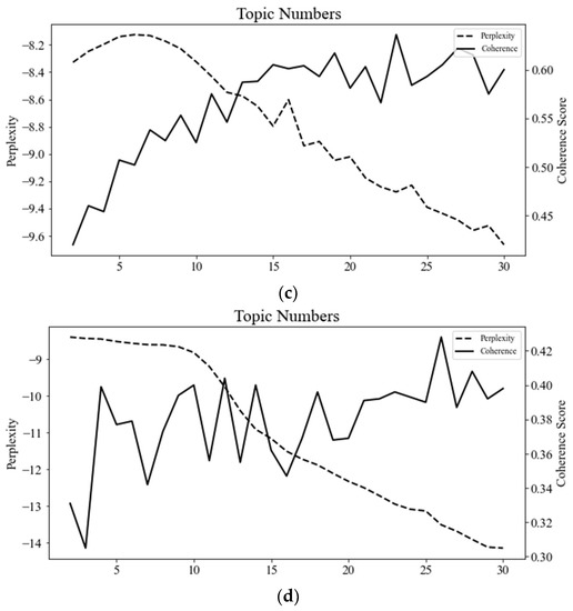 Various approaches have been proposed for determining the optimal number of topics in LDA topic modeling. One possible solution is to balance the trade-off between consistency and exclusivity between semantics and topics [108,109,110,111,112]. Perplexity is commonly used to evaluate how well the model represents the observed data and provides a comparison between theoretical predictions and actual observations [113,114]. Semantic coherence measures the internal coherence of a topic by measuring the frequency of co-occurrence between the most likely words in the original corpus; a higher semantic coherence score indicates that the most frequently used words within a topic are likely to occur together frequently [108]. Exclusivity measures the distinctiveness of a topic by comparing the similarity of word distributions [112]. Therefore, this study adopts a trade-off approach between the perplexity value, semantic coherence, and exclusivity assessment to jointly determine the optimal number of topics in the LDA results.