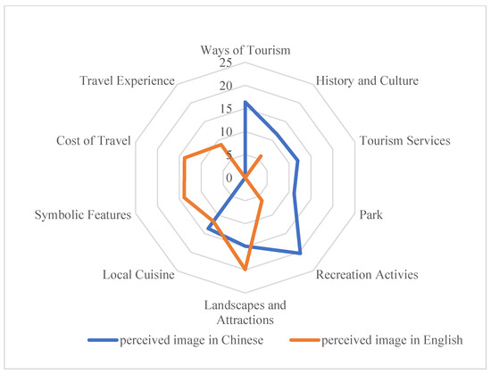The topics associated with the Chinese projected and perceived images, acquired through LDA topic modeling (Table 2 and Table 3), were subjected to comparison with the attributes obtained through manual coding in previous studies (Table 1), in order to refine the general attributes of this study. The refined attributes are presented in the rightmost column of Table 2 and Table 3. The results demonstrate that the attribute of “tourism development” emerged among the attributes of the projected image, which was not identified in prior studies. To provide a more comprehensive comparison of topic attention between the Chinese projected image and Chinese tourists’ perceived image, we have constructed a radar chart in Figure 3. This chart represents the proportion of each topic, enabling a visual assessment of the relative importance of different topics within each dataset.