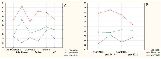 Statistical significance in the distribution of the biodiversity indexes was tested by the repeated ANOVA/MANOVA test and the X2 test. Both tests revealed no statistical significance in the above distribution (Wilkins Lambda = 0.33731, F = 1, 3446, p > 0.05; Figure 4A). The highest values of the Simpson, Shannon, and Menhinik indexes were obtained (see Table 3).