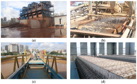Shenzhen Metro Line 13 North Extension Project captured by on-site survey: (a) slurry separation; (b) mud swirling and screening; (c) flocculation–sedimentation; (d) filtration.