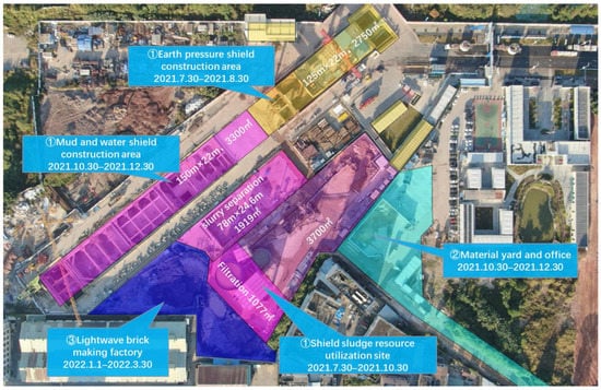 The temporary shield structure construction at Xiacun Station is carried out in three phases, the first of which satisfies the need for flowing mud and contains the primary facilities for shield structure spoil disposal. The shield spoil sorting zone can separate the gravel and sand in the shield spoil; the mud–water separation zone can achieve effective separation of sand and mud in the shield circulation mud, and the separated mud can be used by the mud–water shield machine again through modulating slurry; the modulating mud zone can treat the shield mud separated from mud–water by modulating slurry equipment to achieve mud circulation, and the filtering zone can treat the excess shield. The filter-pressing treatment area can treat the excess waste slurry through filter-pressing equipment to ensure zero construction waste. The mud cake is further compressed and stored in the second and third construction phases. To prevent delays in the construction schedule caused by the inability to transport the slag and mud produced by the shield structure away from the project site, phased construction can effectively relieve construction pressure, prioritize the needs of the metro construction project, and then realize the brick-making of the mud cake. Additionally, the phased construction makes it simple to optimize the workforce, which is helpful for capital recovery and cash flow distribution and raises economic efficiency. Figure 2 demonstrates the schedule setting and layout of the construction of the shield spoil utilization facility for the northern extension of Shenzhen Metro Line 13.