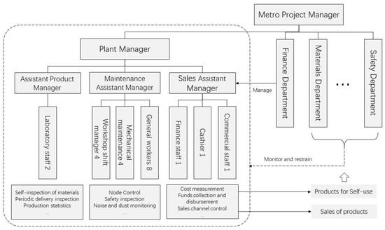 The Shenzhen Metro Line 13 North Extension Resource Utilization Project employed a three-tiered staffing structure, with a plant manager overseeing all resource utilization activities and reporting to the metro construction project manager and three deputy plant managers reporting to him for maintenance, product quality, and sales. The specific organization chart is shown in Figure 3. The maintenance deputy plant manager is in charge of the three project goals of schedule, safety, and the environment; the product deputy plant manager is in charge of the quality of the products and is also under the management of the metro construction project’s material department for self-use products, and the sales deputy plant manager oversees all of the project’s financial work and is under the supervision of the metro construction project’s finance department. Although the resource utilization project is relatively independent in the metro project, it is bound and managed by the metro construction project, especially in the aspect of safe and civilized construction.