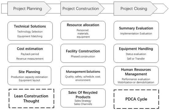 Lean construction ideas are integrated into the resource utilization project implementation framework, and lean construction-related techniques can be incorporated into the implementation and execution according to the needs [29]—for example, standardized management, parallel engineering, 6S management techniques, etc.