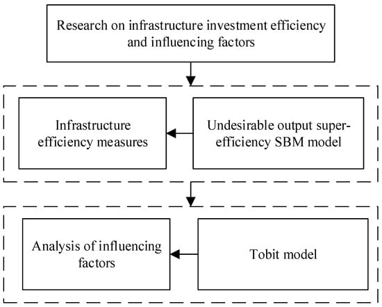 The technology roadmap is shown in Figure 1, first using the undesirable output efficiency SBM model to calculate the urban infrastructure efficiency value, and through the spatial and temporal changes of total-factor productivity and the decomposition efficiency of the Malmquist index value of decomposition, using the Tobit model to analyze the other important input and output indices of the environmental factors on the efficiency of infrastructure investment.