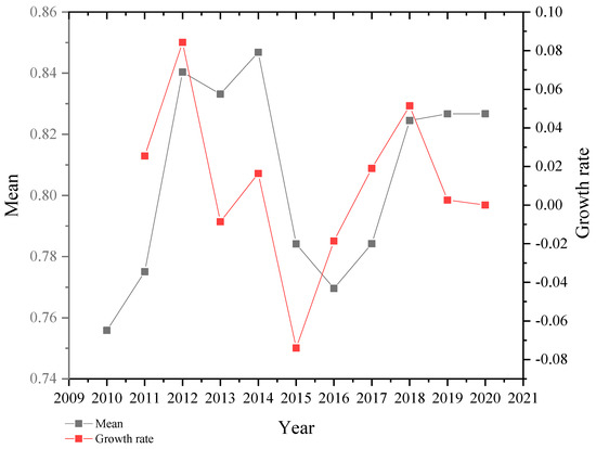 As shown in Figure 2, the average value of Chinese provincial capitals showed a trend of rising first, then decreasing, then rising again. From 2010 to 2014, reaching a peak of 0.85 in 2014, and decreasing from 2014 to 2016, the average efficiency decreased to 0.77 in 2016, and then increased to about 0.83 from 2018 to 2020. The reason is that, in 2013, China issued the Opinions on Strengthening Urban Infrastructure Construction for the first time. During the period of 2013–2017, local governments greatly improved the construction of urban municipal infrastructure such as the water supply, power supply and gas supply, but at the same time, due to the excessive investment in infrastructure, it caused the waste of resources and the increase in carbon emissions. By searching the original data, it is found that the water supply, power supply, and gas supply in Shijiazhuang, Hohhot, Changchun, Hefei, Nanchang, Jinan and Nanning increased significantly. For example, the per capita gas supply in Shijiazhuang increased by 2 times, the electricity consumption increased by 10%,and the carbon emission by 63%; the per capita living water consumption in Hohhot increased by 28%, the electricity consumption of urban and rural residents by 26%, and the carbon emission by 49%. Therefore, an excessive resource input cannot bring about the corresponding improvement in economic level and urban construction level, and will even cause a surge in carbon emissions, leading to a decline in the efficiency of infrastructure investment.