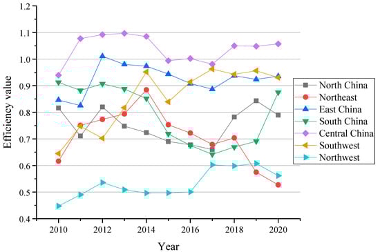 The efficiency values of the seven geographic divisions in 2010–2020 are shown in Figure 3. From the perspective of the seven geographical zones, the regional efficiency value is obviously unbalanced. Specifically, the efficiency of infrastructure investment from high to low is, respectively, Central China, East China, South China, Southwest China, North China, Northeast China and Northwest China. At the same time, it can be seen that from 2010 to 2015, all regions showed a trend of rising first and then declining. From 2016 to 2020, except for the provincial capitals in Northeast China, the values showed a downward trend, while the rest of the regions showed a fluctuating trend. This is related to the high-quality economic development strategy proposed by the Chinese Government in 2017.