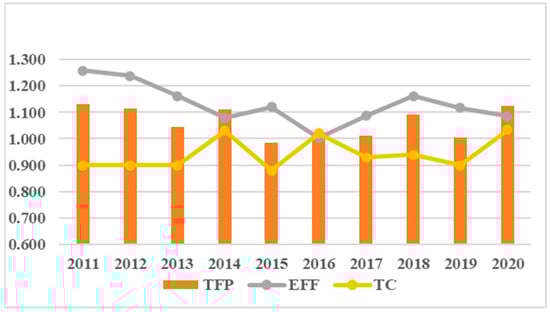 The evaluated DMUk projection value () in the undesirable output super-efficiency SBM model, which is the optimal solution of the model, is the nearest point to the front of the possible production set built by the other DMU. The calculated efficiency value of the undesirable output super-efficiency SBM model is a static description of urban infrastructure investment efficiency, and the Malmquist index can not only measure total-factor productivity (TFP), but can also be decomposed into comprehensive efficiency (EFF) and technical changes (TC); comprehensive efficiency (EFF) can be decomposed into pure technical efficiency changes (PEC) and scale efficiency changes (SEC), where: (1) PEC refers to the effectivity degree of the utilization of the existing technology of the decision unit to maximize the output; (2) TC reflects the long-term innovation ability of the decision unit, and is the real source of the continuous improvement in infrastructure investment efficiency; and (3) the SEC reflects the case where the infrastructure output increment and input increment have the same direction, that is, the matching degree of the infrastructure input and the output. Tthe above index is greater than 1, which is conducive to the improvement in the total productivity factor. The decomposition formula of the Malmquist exponential method is: