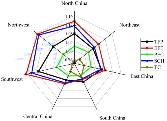 In order to further analyze the reasons for the change in total-factor productivity in urban infrastructure, this paper decomposes the total-factor productivity in provincial capitals, as shown in Figure 5. It can be seen that from 2010 to 2020, the total-factor productivity of Chinese infrastructure in provincial capitals shows an increasing trend, and the total-factor productivity ranking is Southwest China > North China > East China > Northwest China > Northeast China > South China > Central China. The spatial variation of comprehensive efficiency and scale efficiency are consistent, indicating that scale efficiency has a great impact on comprehensive efficiency.