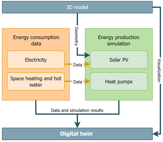 In this paper, a DT was used as a measure to present the research findings. In particular, the DT of a city block was developed to accurately replicate the key features required to accurately predict energy consumption and simulate energy production. The methodological scheme of the proposed DT approach is illustrated in Figure 1.