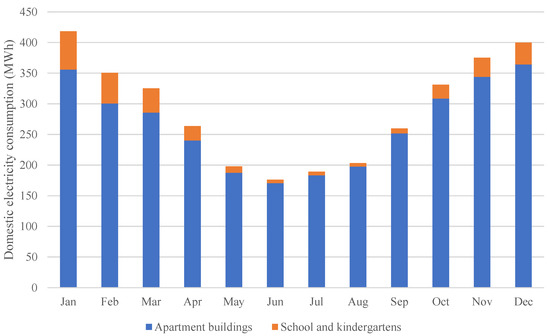 Electricity consumption (in kWh) was estimated using consumption profiles of apartment buildings, a school, and kindergartens in the analysed city block. Domestic electricity demand data for apartment buildings was prepared according to the electricity consumption of two types of families: senior families and families with children. The residents’ data records demonstrated that, on average, senior families consumed approximately 42% less electricity than families with children. The monthly electricity profile for each apartment building was prepared according to the hourly electricity consumption profile of residents on workdays and weekends, taking into account the number of apartments in each building. The data on electricity demand for the school and kindergartens was compiled based on the real hourly electricity consumption of the school averaged over the 2015–2020 period. This profile was also applied to the kindergartens based on the area of the building.