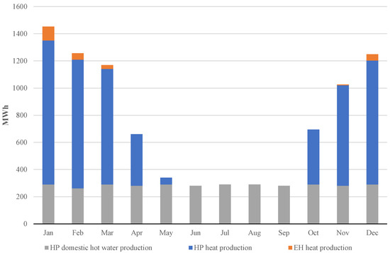 In the energy production simulation, the annual heat demand included both space heating and DHW preparation, which amounted to 8993 MWh/year.