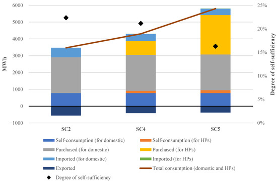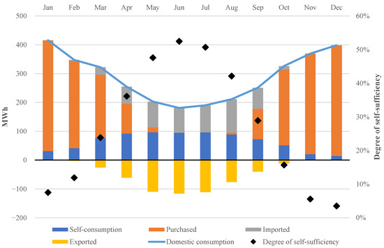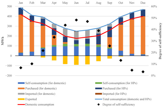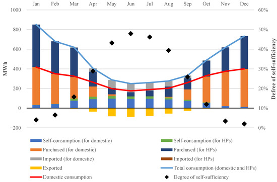 The electricity balances for each building in the block and for the entire block were prepared. The electricity demand for household purposes and building operations was assessed, taking into account the requirement for corresponding amount of electricity to be supplied from the national power grid. In the case where a solar PV system is installed in a building and electricity is produced on-site, the generated PV electricity is first used to meet domestic consumption, and the surplus is supplied to the distribution grid using the “virtual storage” service. In the case where a heating system with HPs and EHs is considered, the surplus of PV on-site generated electricity is used to power this system.