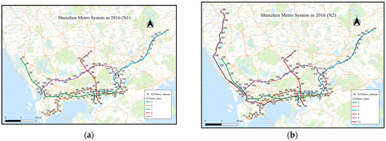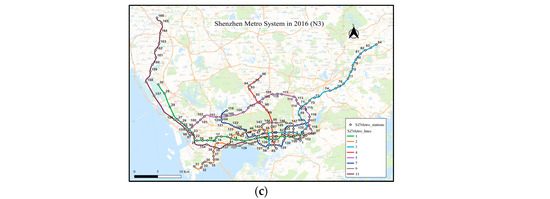 Shenzhen Metro (SZM) was selected as the research object in this study. SZM opened its first line in 2004, and by the end of 2022, it had formed the Shenzhen Metro network (SZMN) with 16 lines, 369 stations, and a total length of 547.38 Km in operation. In 2016, SZM opened line-11 (L-11) on 28 June and line-7/9 (L-7/9) on 28 October. Therefore, the SZMN of 2016 can evolve into three networks according to the time: N1 (from 1 January 2016 to 27 June 2016), N2 (from 28 June 2016 to 27 October 2016), and N3 (from 28 October 2016 to 31 December 2016).
