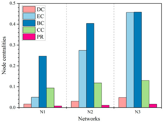 After the complex topology modeling of metro network system, we can analyze the roles and functions of different nodes in the network. In the unweighted complex network, a node’s role refers to the degree of its association with other nodes, namely the node’s accessibility. The centrality of a node can be used to gauge how accessible it is. For instance, as the most direct metric of centrality, DC (Degree Centrality) [39] refers to the number of edges connected to a node, which can measure the importance of the network well. BC (Betweenness Centrality) and CC (Closeness Centrality) [40] utilize the structural information of the whole network to identify influential nodes by measuring the number of shortest paths through a node and the distance to other nodes in the network, respectively. Moreover, EC (Eigenvector Centrality) [39] considers the importance of a node’s neighbors, while PR (PageRank) [41] calculates the order of nodes according to the structure of the incoming link. The above common calculations of node centrality are implemented according to the methods in previous studies [12,19].