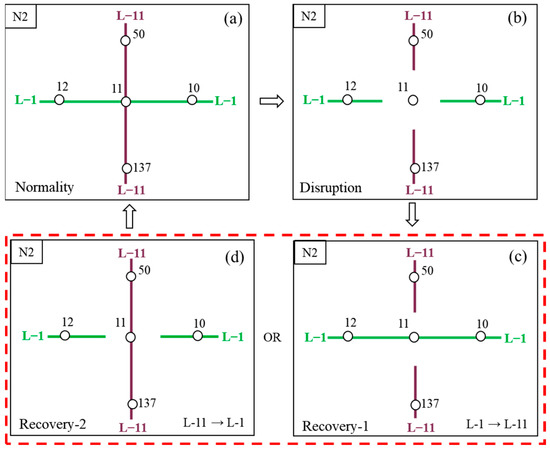 When the network evolved from N1 to N2, L-11 is opened. Then, the CGM station () became a transfer station connecting L-1 and L-11 and it was adjacent to four nodes (). Figure 6 shows the whole process of the CGM station in the N2 network from its initial state to complete interruption and finally full recovery, where (c) and (d) represent recovery strategies; that is, first L-1, then L-11 (the black arrow), and first L-11, then L-1 (the red arrow), respectively. The network performance of N2 is when in normal condition and when in failure condition. Then, network performances under the (c) and (d) recovery strategy are, respectively, and . Finally, the network goes back to the original normal state, which is represented by . Thus, the changing trend of N2 network performance over time after CGM station failure can be obtained, as shown in Figure 7.