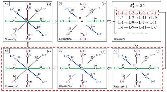 After opening L-7/9, the SZMN developed from N2 to N3, and the CGM station became a four-line transfer station which was adjacent to eight nodes (). As shown in Figure 8, different colors represents different lines, the network began to recover after CGM was completely interrupted and some measures were implemented. The four lines of L-1/7/9/11 can be arranged in sequence, and there are recovery schemes existed. Here, the recovery sequence of L-1/7/9/11 is taken, and the corresponding schematic diagram is shown in the red dotted frame of Figure 8c–e. Next, we also take this sequence as an example to apply the proposed resilience evaluation model.