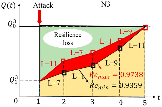 The network performance of N3 is in the normal condition and under the full interruption. When L-1 is regained, the network performance is . Then, it is after recovering L-7 and after recovering L-9. Finally, the network performance is when L-11 is also performing well, and the network N3 restores completely to the normal state. Thus, we can calculate that the network resilience and resilience loss are and , respectively.
