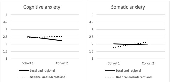 This interaction can be seen in Figure 1, illustrating that when comparing Cohort 2 with Cohort 1, cognitive anxiety decreased in athletes at the local and regional levels, while it increased slightly for athletes who competed nationally and internationally. For somatic anxiety, there was the same pattern but more accentuated, since there was a slight decrease from Cohort 1 to Cohort 2 in athletes at local and regional levels, which contrasts with a marked increase in their levels for athletes with a higher competitive level. There were no statistically significant differences in anxiety levels considering only the competitive level.