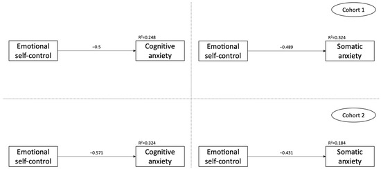 Finally, regression analyses were performed, taking cognitive anxiety as the dependent variable in one of them, somatic anxiety in the other, and emotional self-control as the predictor variable for both cases. The results for Cohort 1 and Cohort 2 can be seen in Table 5. In addition, Figure 2 visually represents the final regression models for each Cohort.