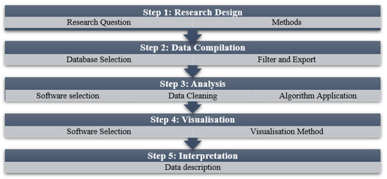 Khatib et al. [22] stated that the bibliometric method is a systematic process that describes published work in terms of top journals, authors from different nations, etc., and is specific to a research area. Scholarly work can be quickly and simply evaluated using a comprehensive approach with the aid of bibliometric analysis. Bibliometric analysis is made up of two key tools: performance analysis and science mapping [20,21]. The current study deploys the five-step science mapping clustering approach to identify the themes of the CLS-based literature, as shown in Figure 1 and proposed by Zupic and Čater [23].