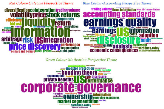 Figure 3 presents a word cloud of the top 50 keywords for each theme. The word cloud for the red theme articles shows that liquidity, return, volatility, price discovery, arbitrage, and integration are the most used keywords in this cluster. This indicates that the red theme publications discuss the stock market-related outcomes of cross-listing from the perspective of stock returns, volatility, volume (liquidity), and price discovery mechanism. Therefore, the red cluster is labeled as the Outcome Perspective Theme (OPT) of CLS.
