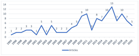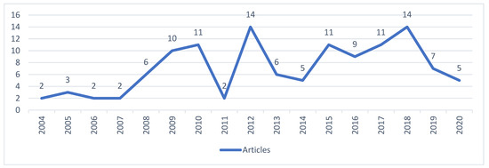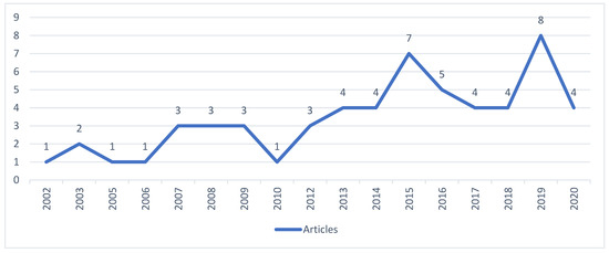 The second cluster of bibliometric analysis is represented in blue in Figure 2. The evolution of the publications of APT over time is provided in Figure 9. This graph shows a trend in publications in the later years. Notably, in 2015 and 2019, many articles were published regarding accounting standards and earnings quality in the context of CLS research.