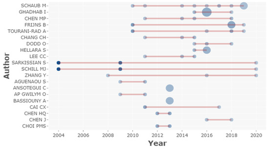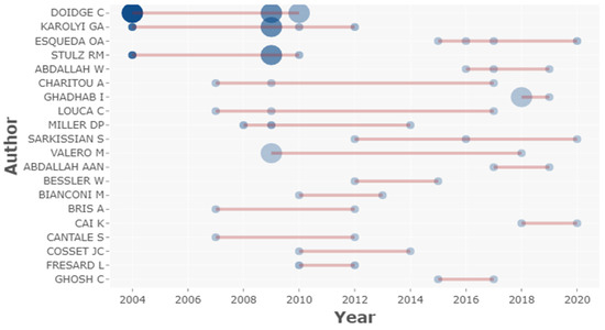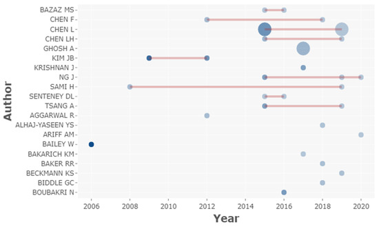 Figure 10 presents the list of top authors over time. This figure shows that Chen L is atop the author list with four articles. Similarly, N.G. contributed to three publications. This indicates that the literature on CLS from an accounting perspective is dispersed among different researchers.