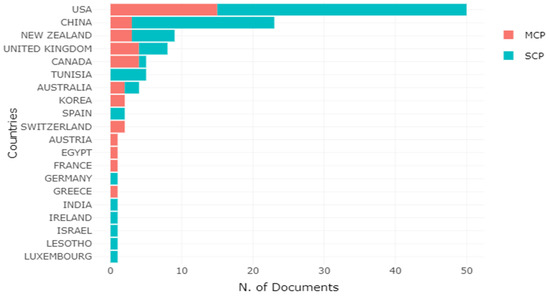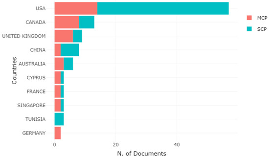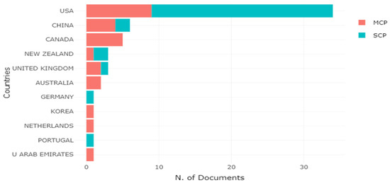 This research also explores the top authors that contribute to this theme, as shown in Figure 5. Schaub M. is the most prominent author, with nine publications since 2010. Similarly, Ghadhab I., Chen MP., Frijns B., and Tourani-Rad A are other influential authors contributing to OPT literature. Figure 6 explores the most prominent countries of origin for the corresponding authors, showing that the U.S., China, New Zealand, and the U.K. are the top countries of corresponding authors. One of the reasons behind more research being conducted in these countries could be due to the increasing trend of cross-listing shares in these countries. It is also notable that most of the studies are SCPs (Single-Country Productions), while fewer studies involve collaboration between authors from multiple countries (i.e., MCP—Multi-Country Production).