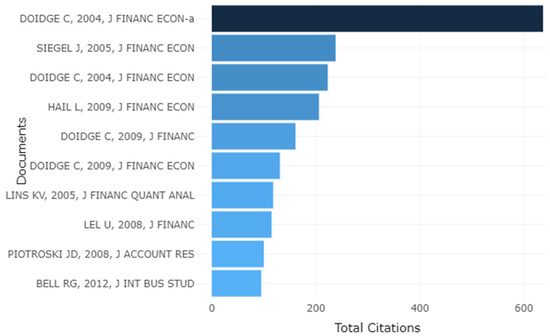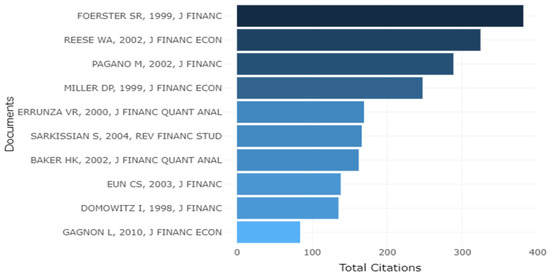 Our study also considered the top 10 publications (based on total citations) related to OPT, as presented in Figure 7. For instance, a study by Foerster and Karolyi [32] is the most cited document among OPT publications. They investigated the impact of cross-listing on stock returns. They found that share value changed positively after the event of cross-listing and helped in raising low-cost capital. The second most cited document, authored by Reese and Weisbach [33], studied investor protection after cross-listing. They examined the hypothesis that cross-listing increases minority shareholders’ protection and enhances managers’ expected cost of removing isolated benefits. Their results reveal that a key motivation for non-US firms to cross-list their shares is to protect minority shareholder interest.