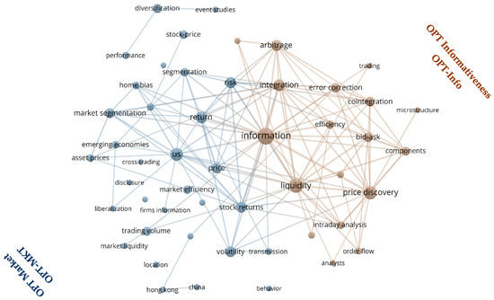 A co-occurrence network of keywords (VOS Viewer) is presented in Figure 8 to highlight the conceptual structure of OPT publications. A criterion of minimum link strength of three shows the links between the nodes. Similarly, the size of each node indicates the relative frequency of occurrence. The figure shows that OPT-based literature can be divided into two sub-fields based on its conceptual structure. The top keywords used by the first sub-theme include information, liquidity, price discovery, arbitrage, integration, and cointegration. This means that this domain investigates the liquidity and price discovery of cross-listed stocks, particularly for asymmetric information, arbitrage opportunities, and market integrations between home and foreign markets. This sub-field is named OPT-Info (OPT-Informativeness). For instance, Frijns et al. [42] studied the impact of home and foreign market integration on the price discovery of cross-listed stocks in New Zealand and Australia. They reported that growth in the Australian market increases its informativeness, ultimately decreasing the bid–ask spread.