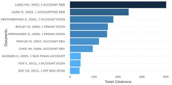 Figure 12 explores the top publications regarding APT. The study of Lang, Raedy, and Yetman [51] is the most cited document. Though Figure 12 also presents the same reference as the second most cited document, these two articles are the same, differing only due to name discrepancies. Their study compared US GAAP adopted by the U.S. local firms with accounting standards adopted by foreign cross-listed firms. Their results found that cross-listed firms are less hostile in financial reporting and earnings management, and their stock prices adjust to awful news quickly. Our findings are consistent with an empirical study by Leuz et al. [52], who reported that firms operating under weak investor protection environments tend to engage in earnings management more often than not. This finding is also notable from the perspective of the established notion that the legal and regulatory environment is less stringent for CLFs, and as such, motivations for managing the earnings are more significant. Thus, earnings management is also a severe issue for all such CLFs.