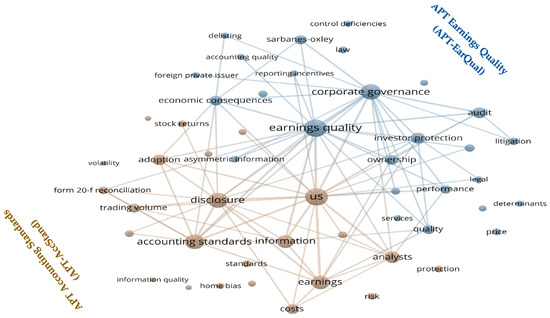 Figure 13 provides the co-occurrence analysis of keywords for APT. According to the co-occurrence analysis, the literature on APT can be segregated into two sub-fields. The top keywords of the first sub-field are earnings quality, corporate governance, ownership, investor protection, and audit. This list shows that this sub-field of APT focuses on earnings quality and corporate governance issues such as ownership structure and investor protection. This sub-field is named APT-EarQual (APT-Earnings Quality). For instance, Huijgen and Lubberink [55] compared the earnings management of cross-listed stocks with those of single country-listed stores in the U.K. Their results showed more earnings conservatism in cross-listed firms than single-listed firms, particularly in the early years of cross-listing. Choi et al. [54] also reported that cross-listing results in higher audit fees, especially when a foreign country’s legal regime is stronger than the home country’s legal regime. Similarly, Lin et al. [61] argued that the listing environment affects the ability of the audit committee to manage their earnings. Conversely, Ndubizu [62] investigated the benefits of high earnings and profits of cross-listing while comparing IPO and non-IPO listings. Srinivasan et al. [63] investigated the frequency of restatement mistakes in foreign-listed stocks in the U.S. and found that the restatement frequency of cross-listed stocks is lower than that of local firms. More recently, Kamarudin et al. [6] studied the impact of cross-listing on the quality of earnings but in the contingency of investor protection. Due to the discussion above, we can conclude that APT-EarQual focuses on the quality of earnings concerning different perspectives and environmental settings.