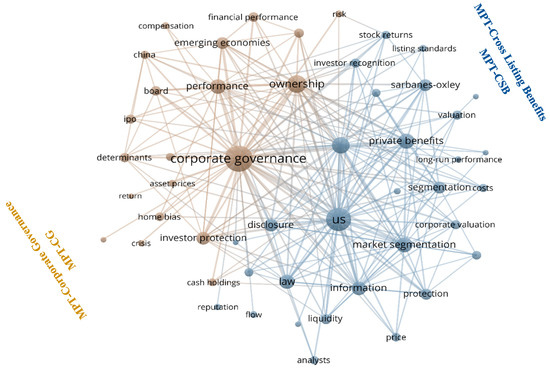 This research also studied the conceptual structure of three identified themes using a co-occurrence network of keywords. The analysis showed that OPT discussed the outcomes of cross-listing from two perspectives. The first type primarily focused on asymmetric information (OPT-Info) to explain price discrepancies and market integration. Conversely, other studies related to OPT mainly investigated the risk and returns concerning market efficiencies, particularly in emerging markets (OPT-MKT). Similarly, articles on APT studied the two sub-fields regarding earnings quality (APT-EarQual) and the adoption of accounting standards (APT-Accutane). The articles on MPT also studied cross-listings from two perspectives. The first type focusses on the benefits of cross-listing (MPT-CLB) that motivate firms to cross-list using different theories such as market segmentation, bonding, and liquidity theory. Conversely, the second sub-field from MPT focuses on corporate governance (MPT-CG) issues from different perspectives, such as executive compensation.