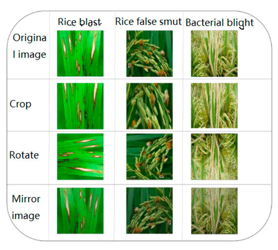 Based on the complexity of the current convolutional neural network, too little sample data cause the model to over-fit and the training ends, so a large number of learning and training pictures are required. The experimental data are image samples obtained from the website of the national plant pathology Association of America (URL: https://www.kaggle.com/datasets), open-source image samples obtained on the website, and image samples taken in actual rice fields. It mainly includes rice blast, rice false smut, and rice bacterial blight. The tools for obtaining data in actual rice fields are HD cameras and smartphones. The original data obtained include 555 images of rice blast, 646 of rice false smut, and 345 of bacterial leaf blight, as shown in Figure 1. Through the data enhancement methods of clipping, multi-angle rotation, and vertical image, the sample library of disease images was expanded, and, finally, 2000 images of the three diseases were obtained.