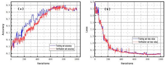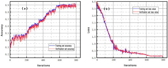 Firstly, we initialized the data and set the size to 224 × 224, and set the learning rate to 0.01. Four groups of schemes are set up in this experiment, and 400, 600, 800, and 1000 are selected as the iteration times. The relationship between the iteration times and the accuracy of the model is observed, and the parameters that are most suitable for the experimental model are selected. Figure 4 shows the results of the identification model of the change in the number of iterations. As shown in the figure, when the number of iterations is less than 800, the accuracy of the verification set increases with the increase in the number of iterations. When the number of iterations exceeds 800, the accuracy of the training set changes slightly and gently. When the number of iterations is 796, the accuracy of the training set is the highest, which is 90.32%. Too many iterations increases the running time of the model and reduces the computational efficiency, so 800 iterations were selected in all subsequent experiments.