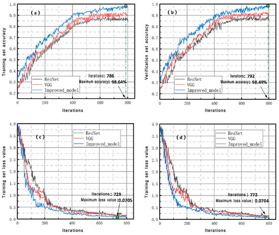 In order to reduce the calculation error, this verification also refers to other methods [20,21,22]. The recognition accuracy of these three diseases under the VGG and ResNet models is selected, and the analysis results are shown in Figure 6. From Figure 6a,b, we can see that the highest accuracy for VGG and ResNet in the training set is 0.9258 and 0.886, respectively, and the highest accuracy of the improved model in this study in the training set is 0.9864, which is 0.0606 and 0.1004 higher than the aforementioned two models, respectively. The highest accuracy for VGG and ResNet in the verification set is 0.9186 and 0.9, respectively, and the highest accuracy of the improved model in this study in the verification set is 0.9849, which is 0.0663 and 0.0849 higher than the aforementioned two models, respectively. From Figure 6c,d, we can see that the lowest loss values for VGG and ResNet in the training set are 0.1108 and 0.125, respectively, and the lowest loss value for the improved model in this study in the training set is 0.0705, which is 0.0403 and 0.0545 lower than the aforementioned two models, respectively. The lowest loss values for VGG and ResNet in the validation set are 0.1035 and 0.132, respectively, and the lowest loss value for the improved model in this study in the validation set is 0.0704, which is 0.0331 and 0.0616 lower than the aforementioned two models, respectively. To sum up, the model adopted in this paper has advantages over VGG and ResNet in the recognition accuracy of the three kinds of diseases studied in this experiment. On the other hand, this model has fewer parameters and faster calculation.