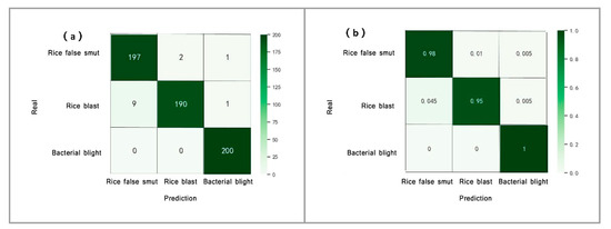 Distribution of three rice diseases: confusion matrix (a); normalized confusion matrix (b).