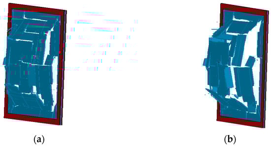 Failure states of glasses under different blast loads. (a) Pr = 12 kPa, Ir = 100 kPa·ms; (b) Pr = 14 kPa, Ir = 100 kPa·ms.