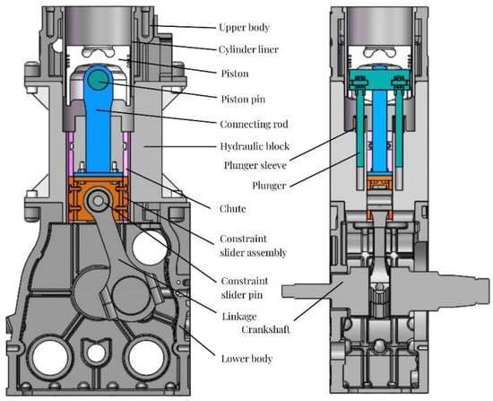 Figure 2. The first working chamber is the combustion chamber, where the expanding pressure generated by diesel combustion in the cylinder drives the piston’s linear motion. The second working chamber is the pump chamber, where the piston pin drives the plunger’s reciprocating linear motion within the pump chamber, working in conjunction with the distribution valve to perform oil suction and discharge. During oil suction, the piston pin moves the plunger upward, creating a vacuum in the pump chamber. The hydraulic oil is drawn into the pump chamber through the suction check valve. During oil discharge, the piston pin pushes the plunger downward, and the hydraulic oil in the pump chamber is forced out through the discharge check valve, generating high-pressure oil and completing the oil suction and pressure cycle. The third working chamber is the rotational power chamber, where the motion of the connecting rod, constrained slider assembly, linkage, crankshaft, and flywheel converts the piston’s linear motion into the rotational motion of the crankshaft and flywheel assembly. The overall structure defines the upper and lower limits of the piston’s motion, with the crankshaft connected to the flywheel, which serves as an energy storage device, ensuring the continuous operation of the main motion system. The auxiliary systems include the fuel supply system, valve mechanism, lubrication system, cooling system, and starting system, among others.